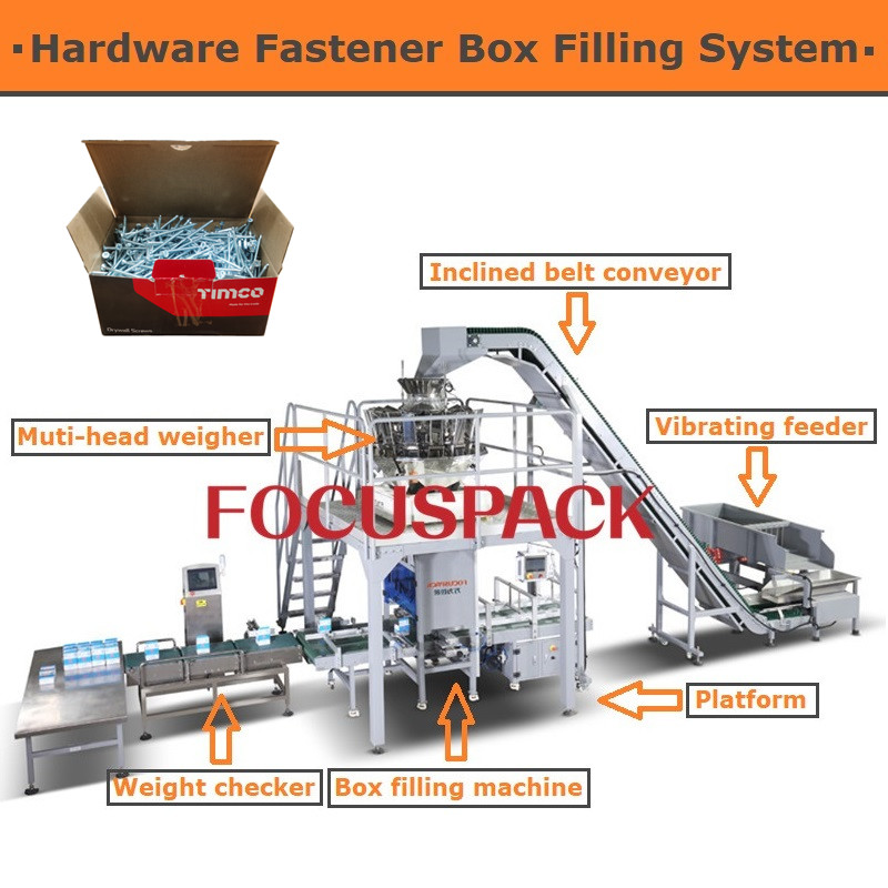 Description: This system(automatic rivet packing machine) can realize automatically feeding, conveying, weighing, filling and packing into boxes. It has two box filling and packaging lines that work alternately, which improve the effectiveness of production and lower the labour cost.